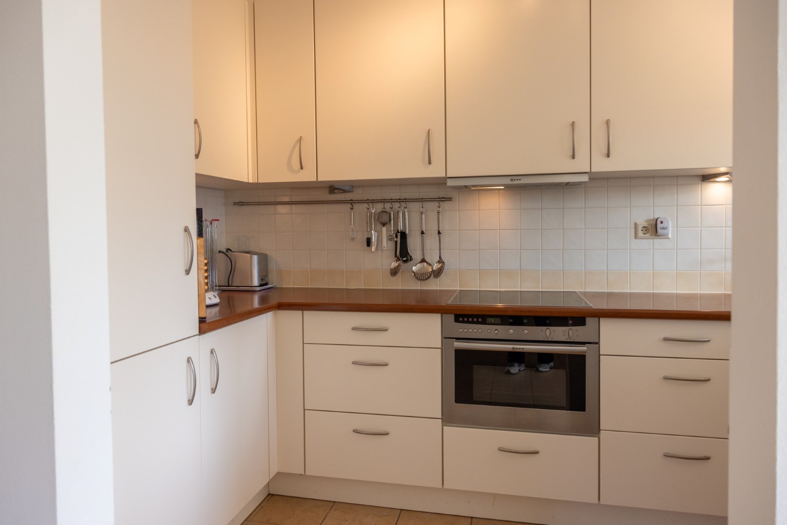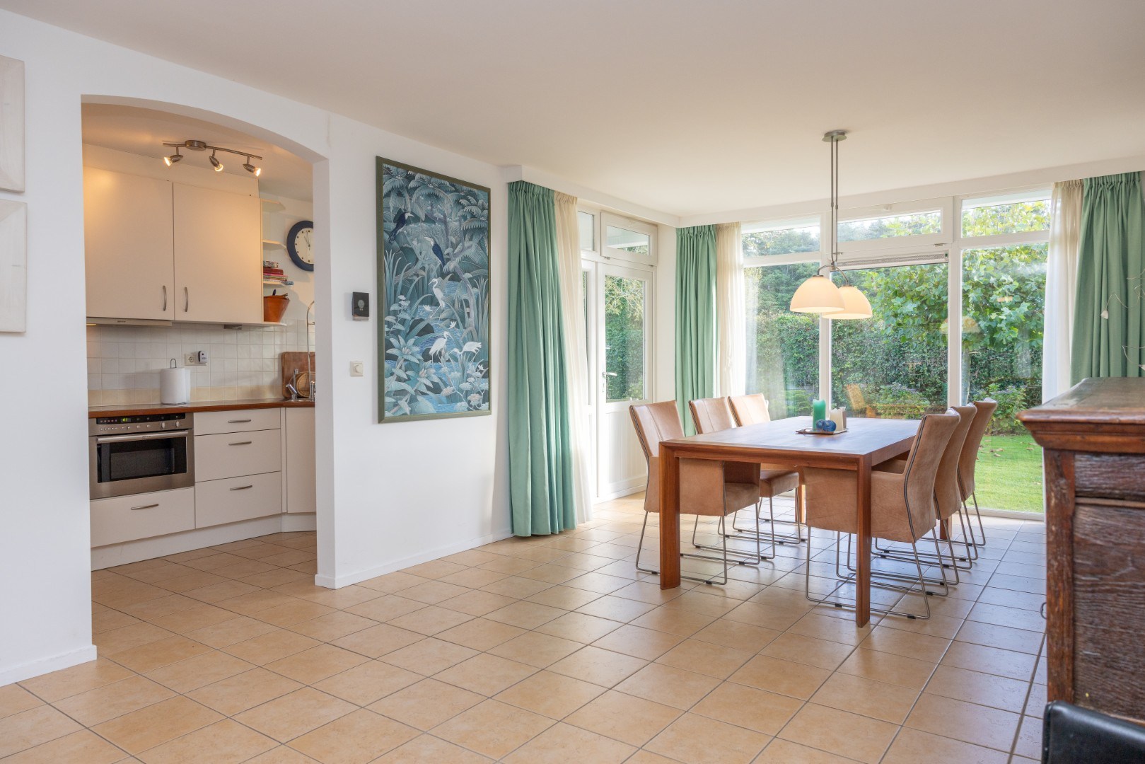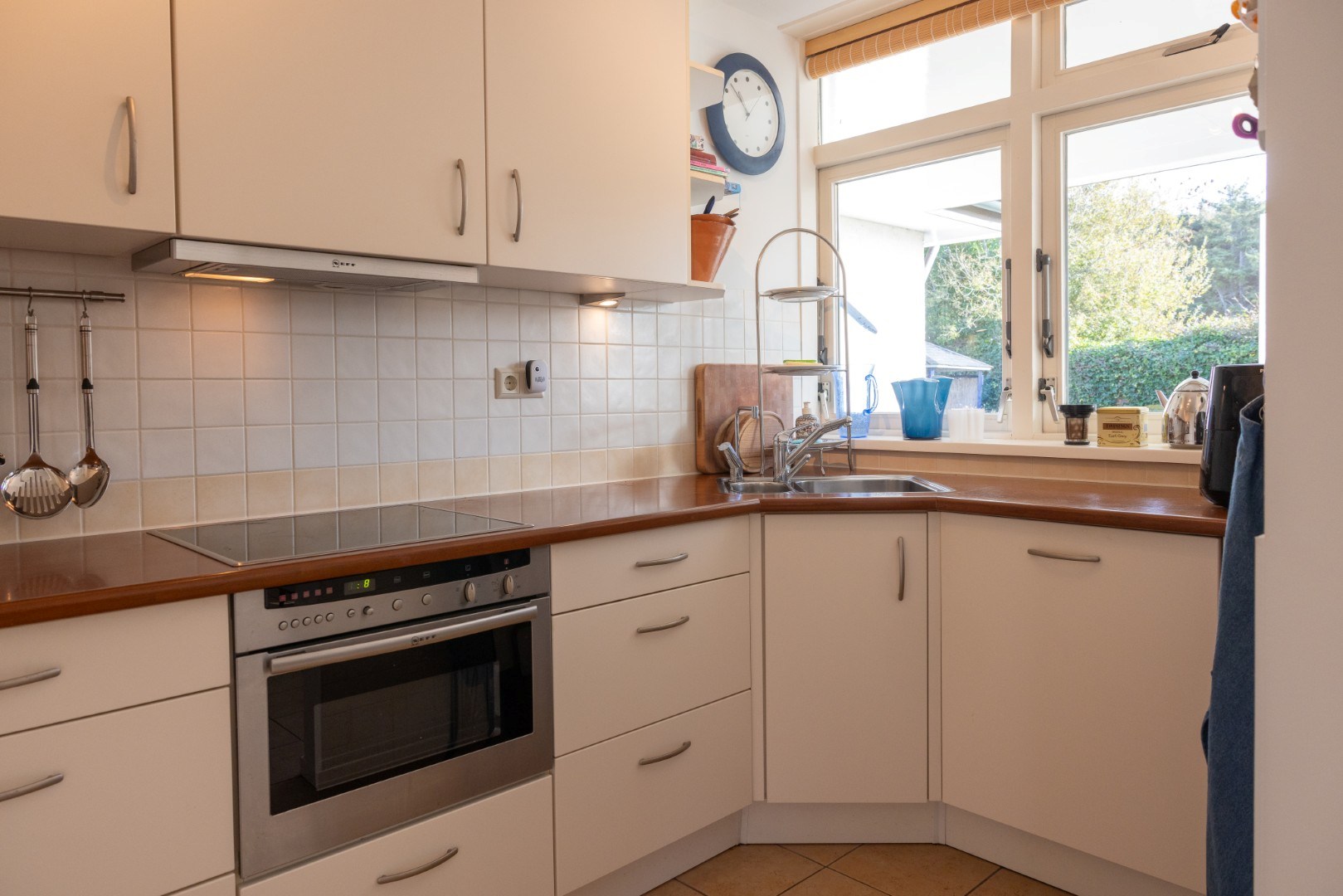 De keuken heeft een U-opstelling, heeft veel berg- en werkruimte en is voorzien van (inbouw)apparatuur: kookplaat, afzuigkap, combi-magnetron, koel-/vriescombinatie (± 2023), vaatwasser (± 2024), én een Quooker.