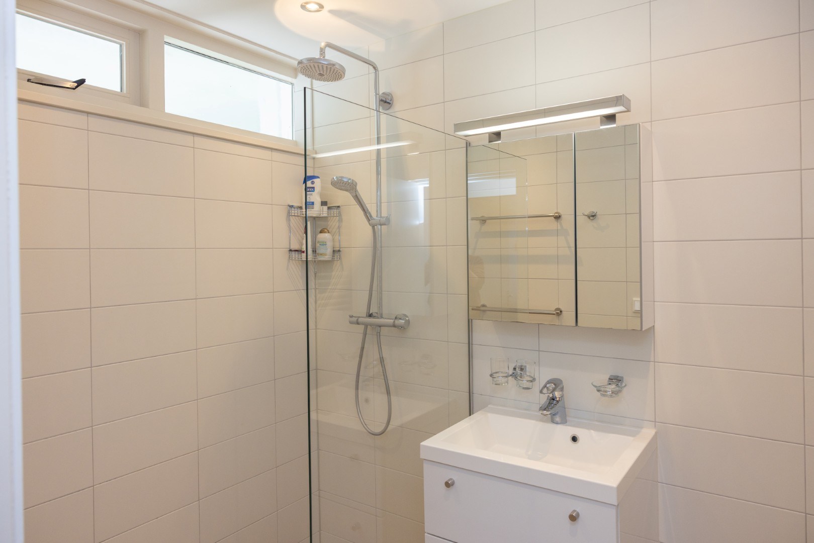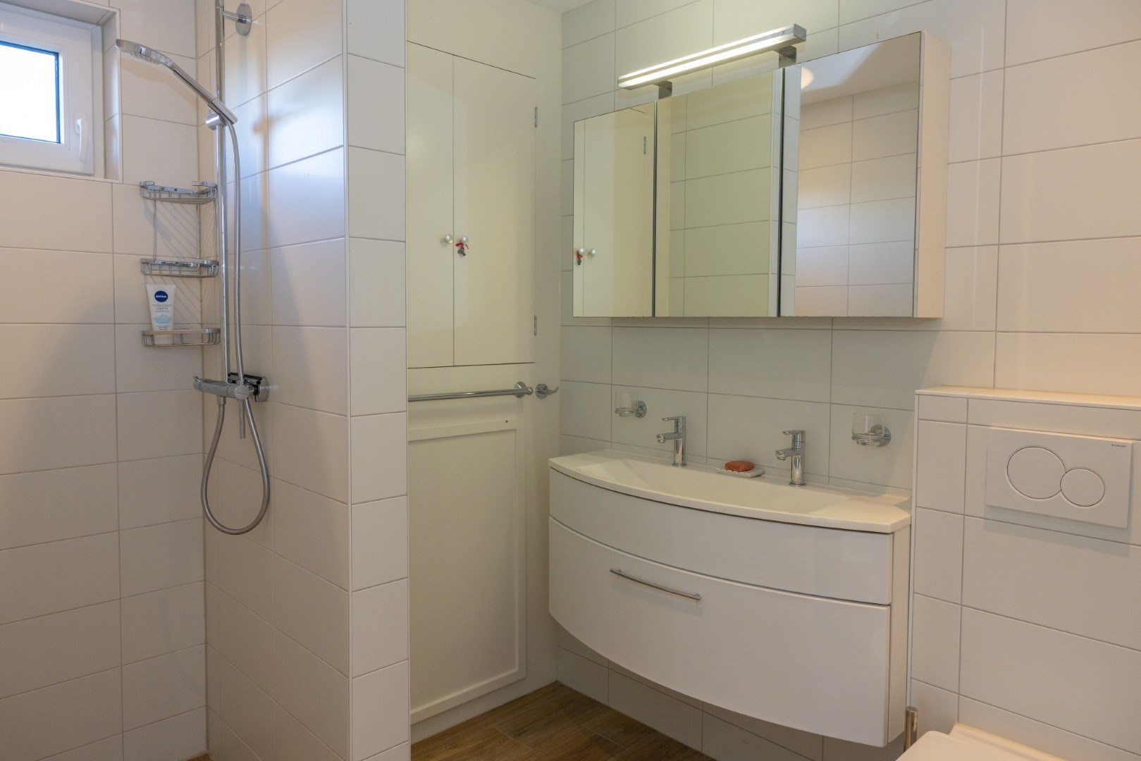 Das zweite Badezimmer im Erdgeschoss ist mit einer begehbaren Dusche und einem Waschtischmöbel ausgestattet. Die Toilette ist separat.