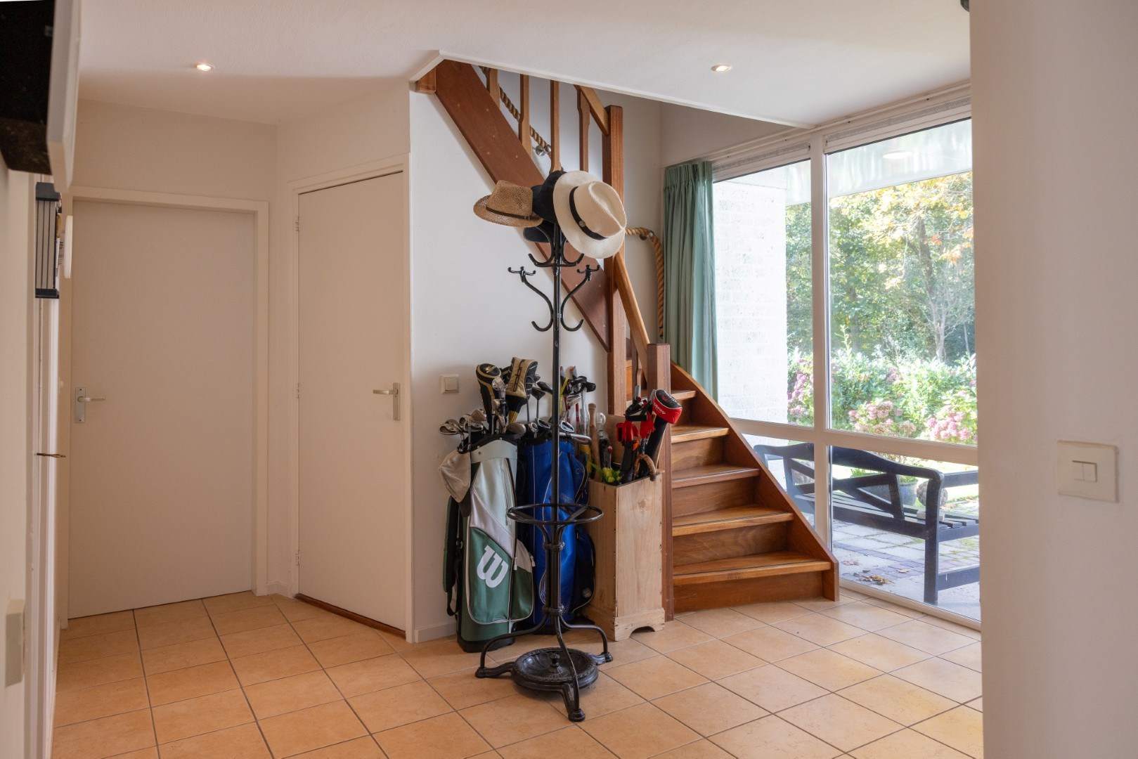 Ruime hal/entree met trapopgang en trapkast, en een separaat toilet. De woonkamer is voorzien van een tegelvloer met comfortabele vloerverwarming, heeft een houtkachel, en is door de vele ramen lekker licht. Via de tuindeur bereikt u het terras en de zonnige tuin.