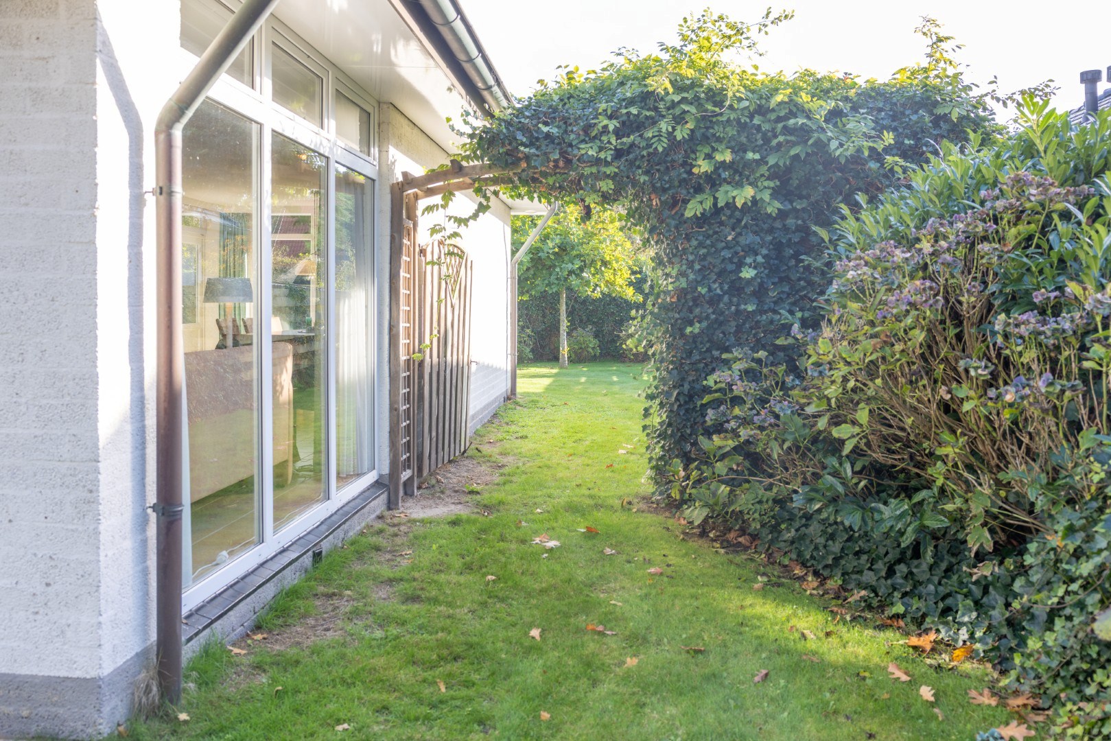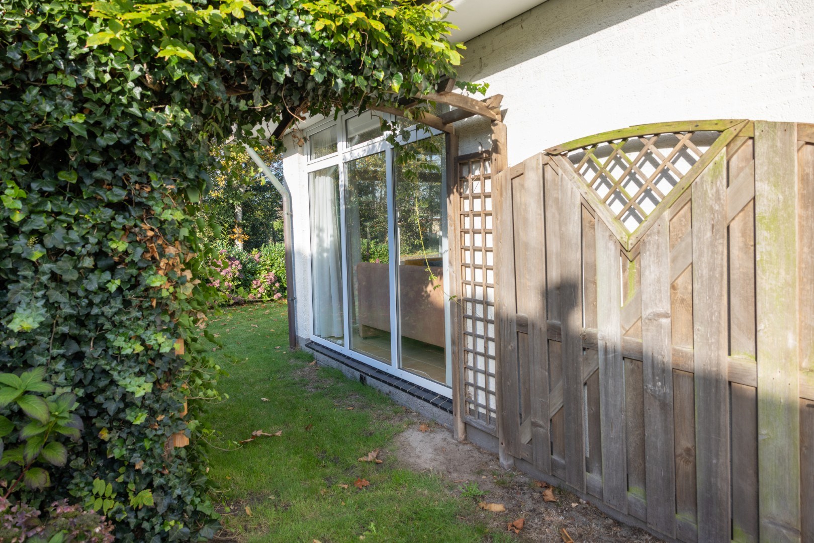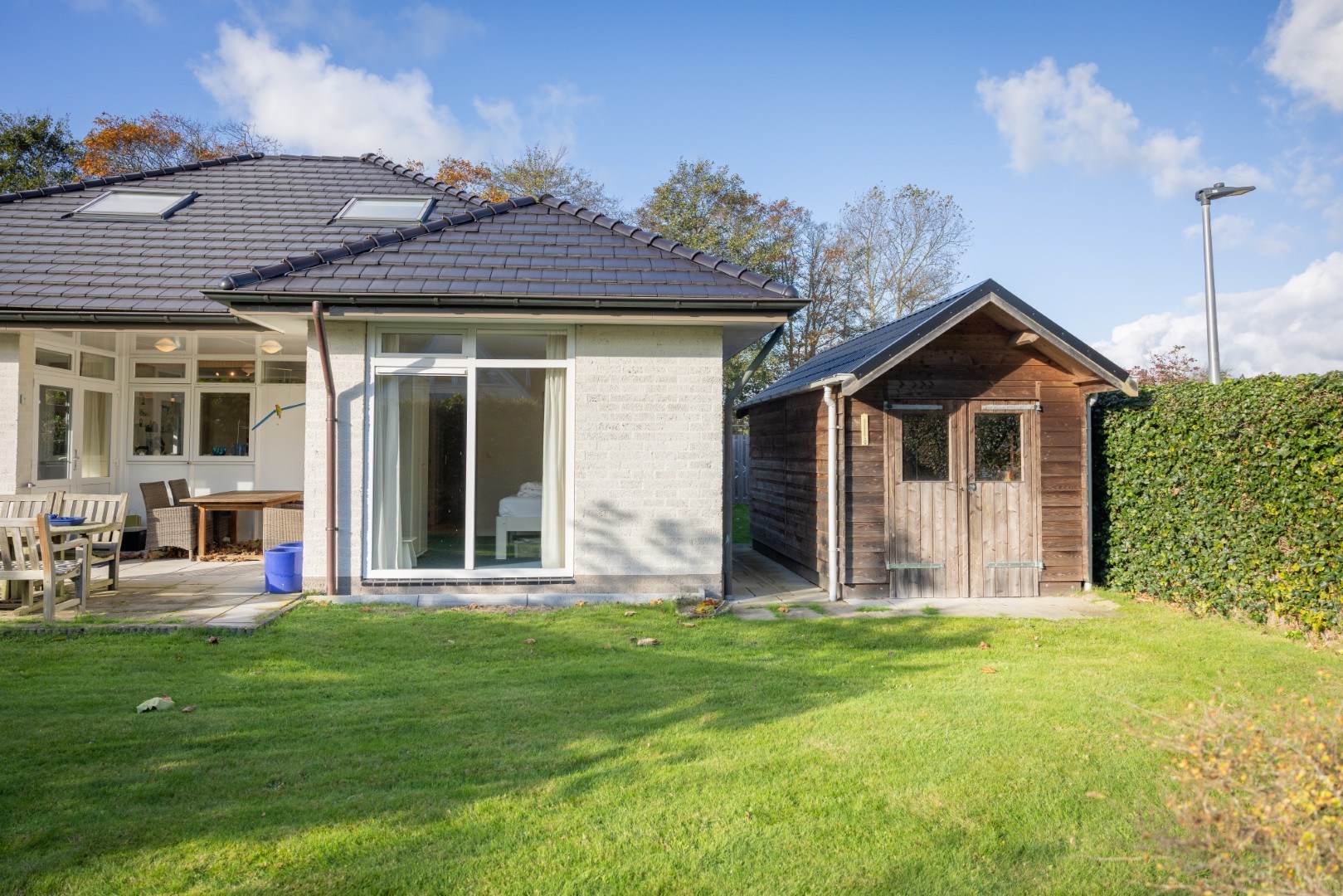 In de beschutte tuin een prieel voor een heerlijke plek in de avondzon, een tweeledige berging van 12,5 m², een terras direct bij de woning en veel groen. Geniet in de (na)zomer van de prachtig bloeiende hortensia’s, of van een plekje in de schaduw onder de Platanen.