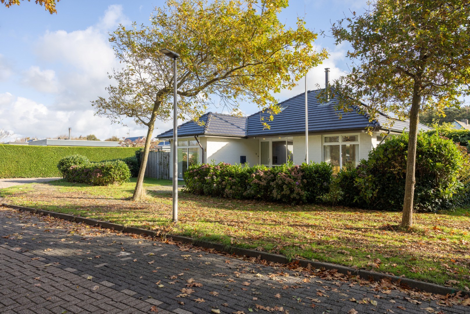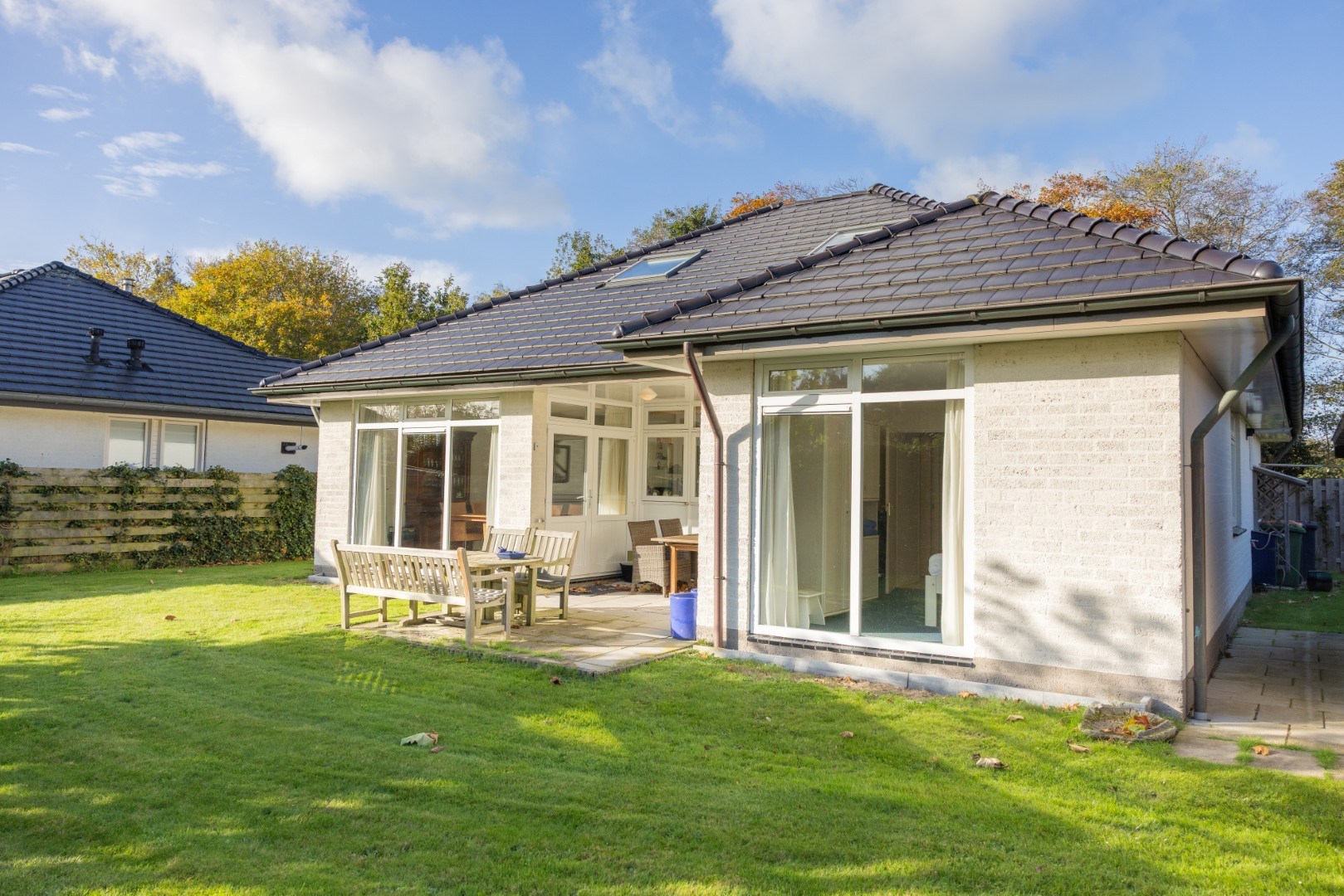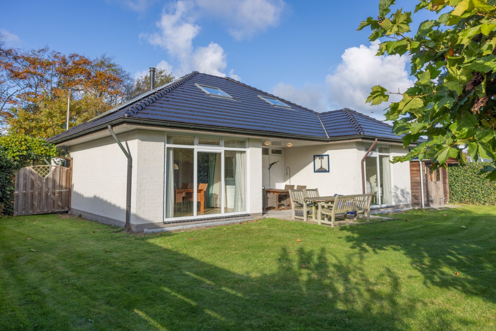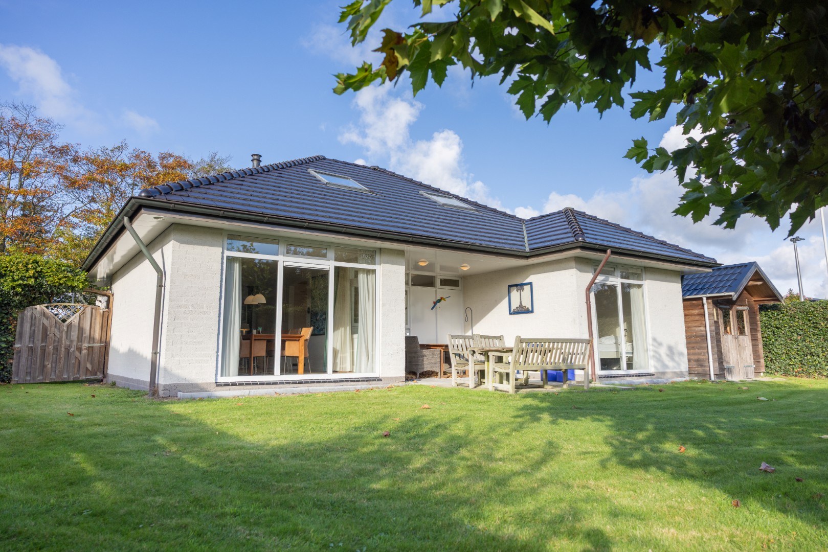 In de beschutte tuin een prieel voor een heerlijke plek in de avondzon, een tweeledige berging van 12,5 m², een terras direct bij de woning en veel groen. Geniet in de (na)zomer van de prachtig bloeiende hortensia’s, of van een plekje in de schaduw onder de Platanen.