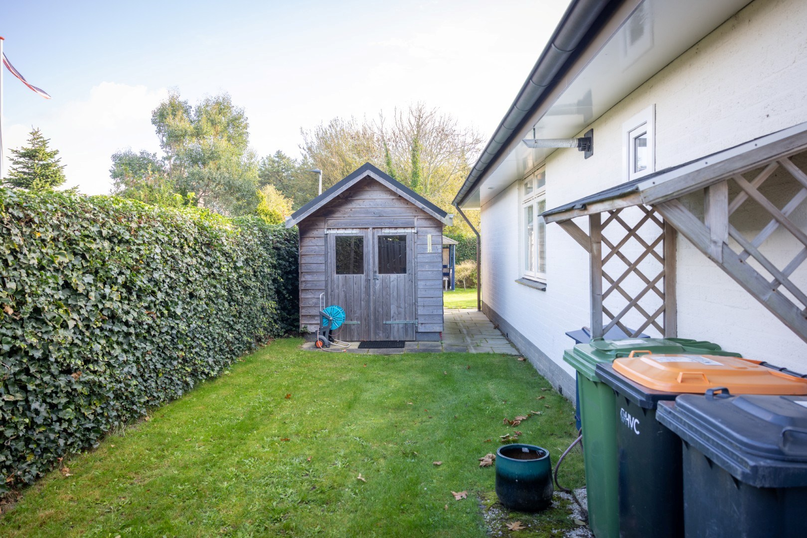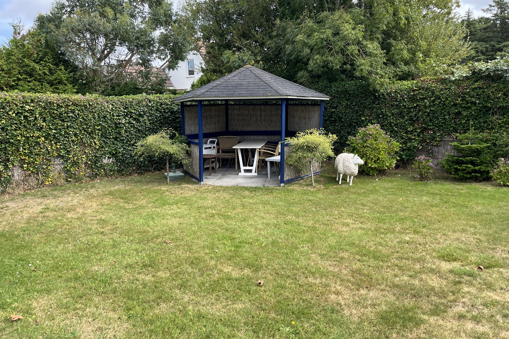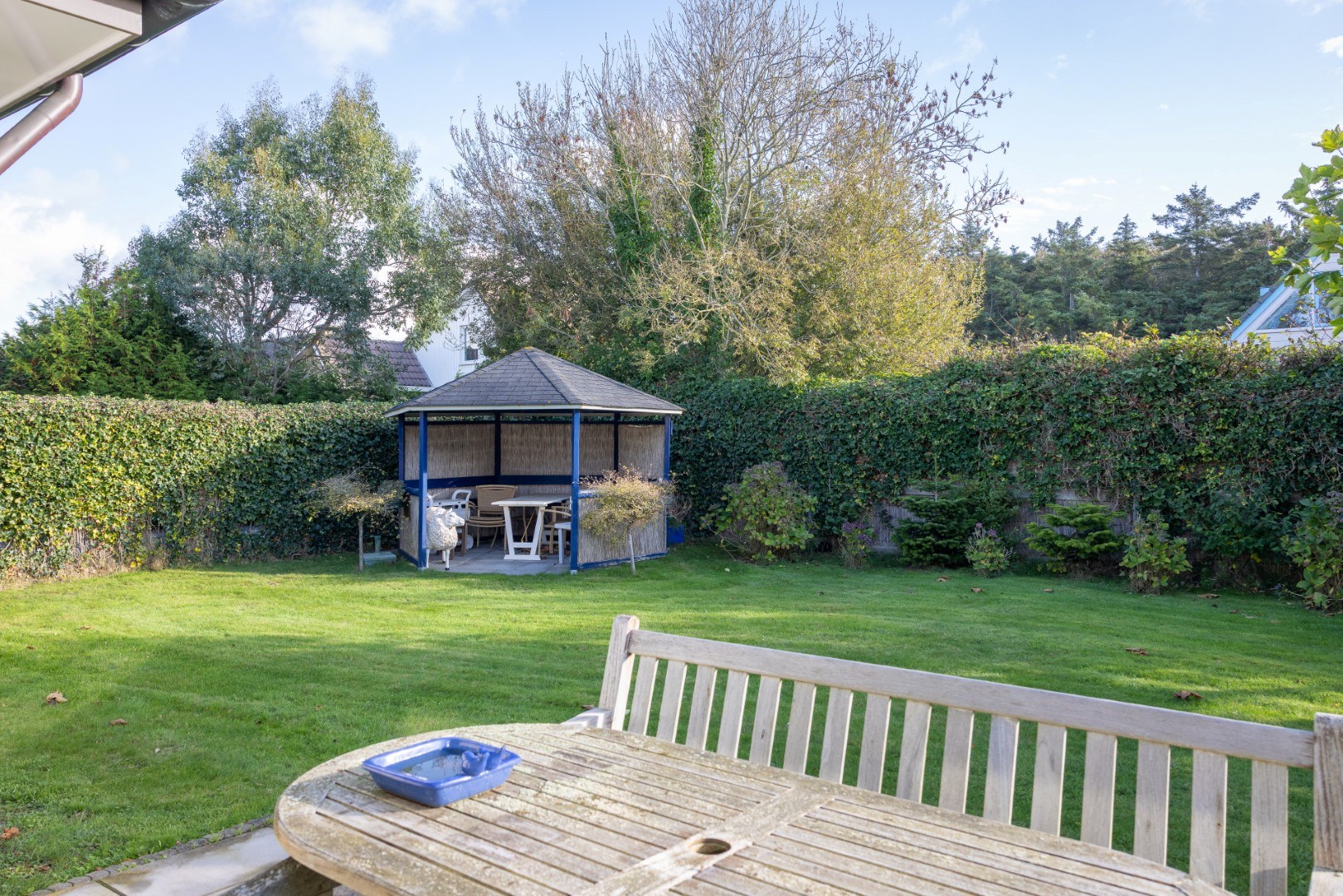Im geschützten Garten finden Sie einen Pavillon für einen herrlichen Platz in der Abendsonne, einen zweigeteilten Abstellraum von ca. 12,5 m², eine Terrasse direkt am Haus sowie viel Grün. Genießen Sie im (Spät-)Sommer die prachtvoll blühenden Hortensien oder einen schattigen Platz unter den Platanen.
