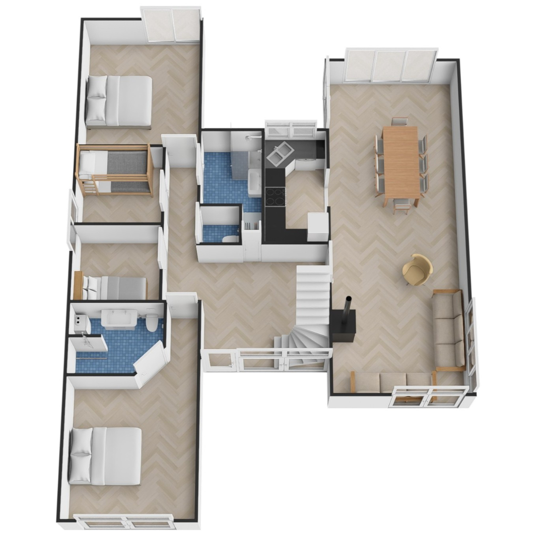+ Uitgebreid modern sanitair: 2 badkamers beneden, 3 toiletten: 2 beneden, 1 boven.