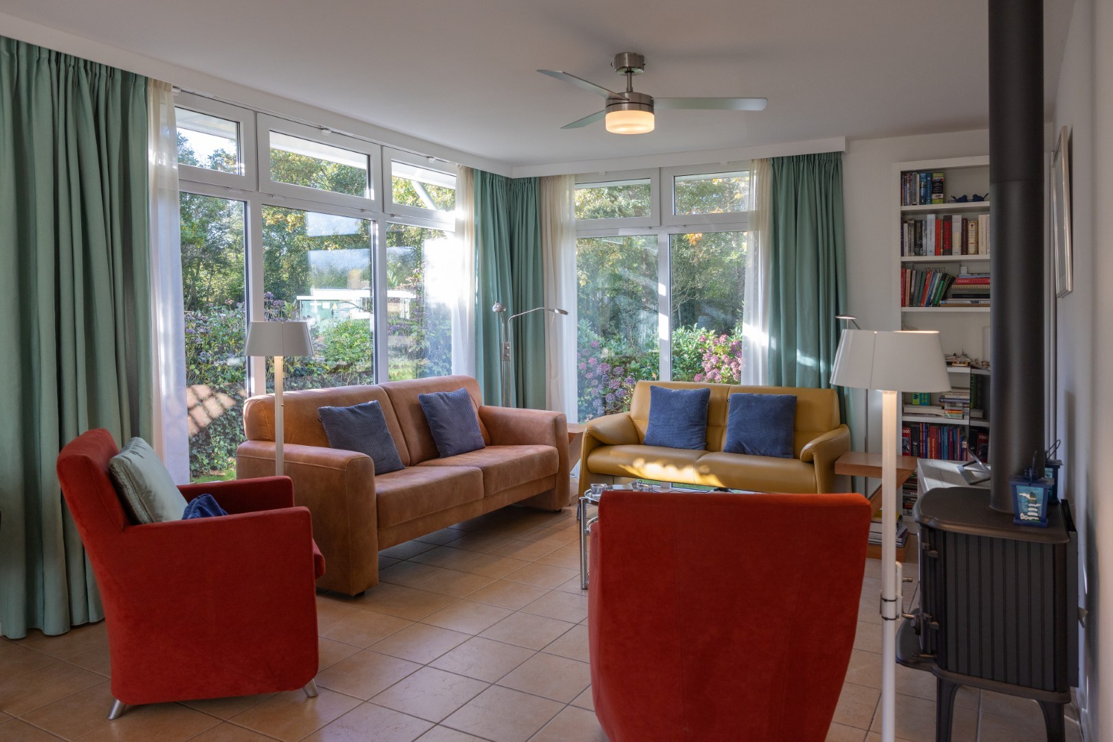 Großzügige Diele/Eingangsbereich mit Treppenaufgang, Abstellraum unter der Treppe sowie separatem WC. Das Wohnzimmer ist mit einem Fliesenboden mit komfortabler Fußbodenheizung ausgestattet, verfügt über einen Holzofen und ist dank der vielen Fenster angenehm hell. Über die Gartentür gelangen Sie auf die Terrasse und in den sonnigen Garten.